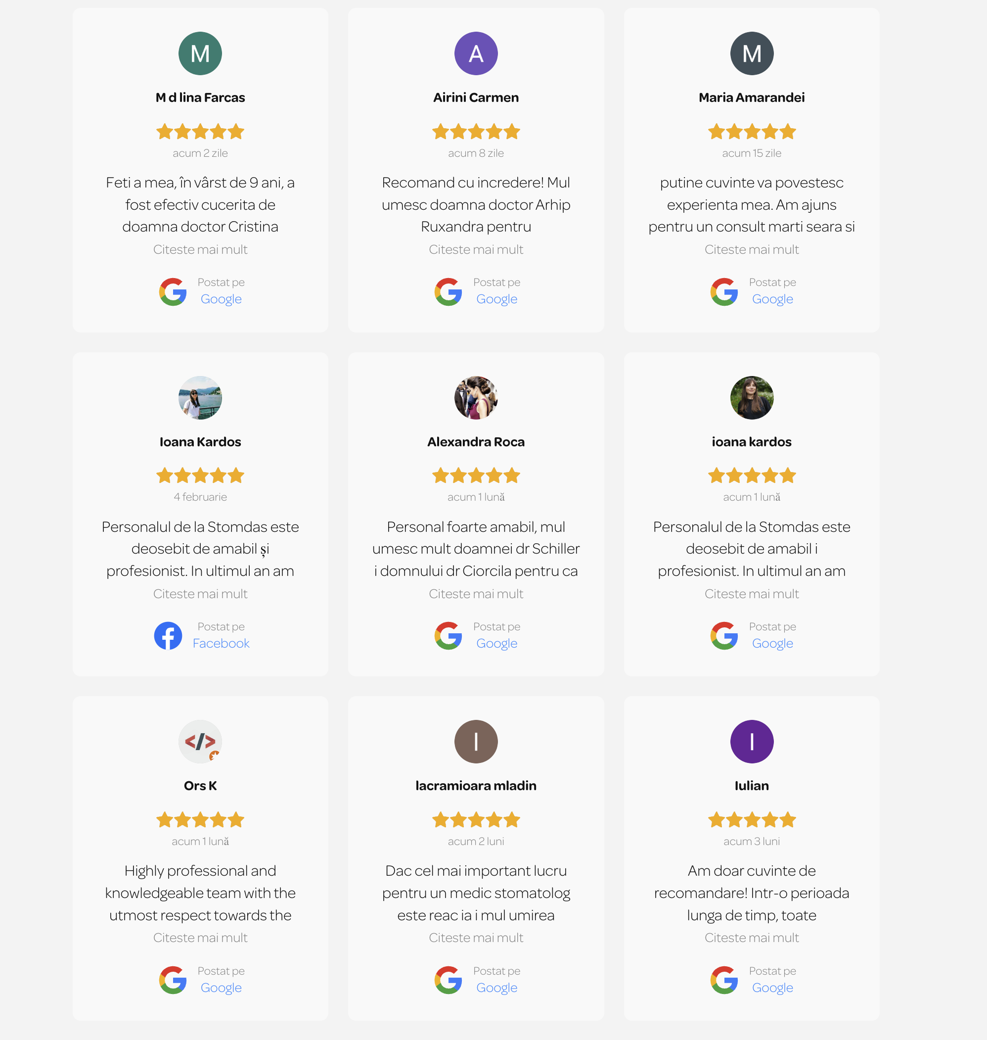 Suntem recunoscători să avem o echipă de medici dedicați, empatici și atent pregătiți, care colaborează pentru a vă oferi îngrijirea de care aveți nevoie și pentru a contribui la sănătatea și echilibrul zâmbetului dumneavoastră.